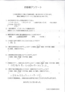 Y様 この度は、弊社をご用命いただき、有難うございます。御見積もりの依頼にご来店いただいた際、弊社の隣にあるハイツを指差して「これと同じ作りのハイツだから見積もって」とおっしゃっていたこと、とても印象深く記憶に残っております。無事に工事を終え喜んでいただいたと、担当者からきいておりました。工事金額、片付けや清掃に関して「普通」とのご回答いただきましたこと、ご希望に添えず申し訳ございませんでした。大満足が頂ける様、気を引き締めて今後につなげていきたいと思います。有難うございました。